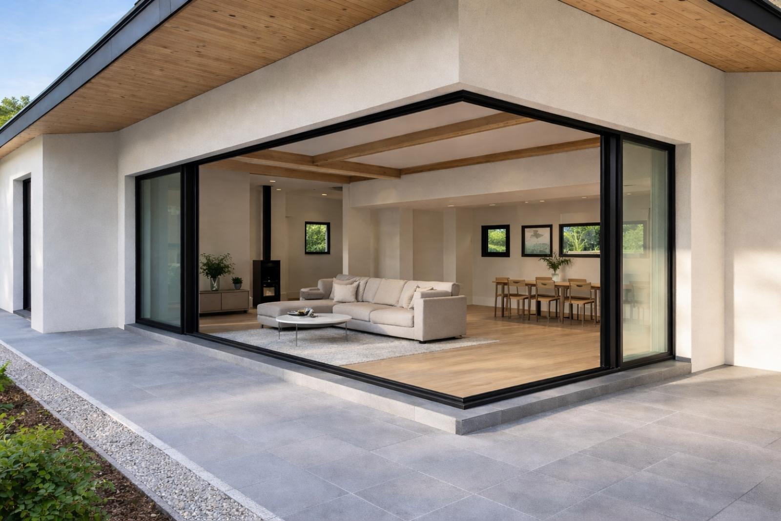 La baie vitrée coulissante d’angle sans poteau permet une ouverture panoramique, sans montant d’angle. Le résultat est net, contemporain et parfaitement intégré à l’architecture de la maison.