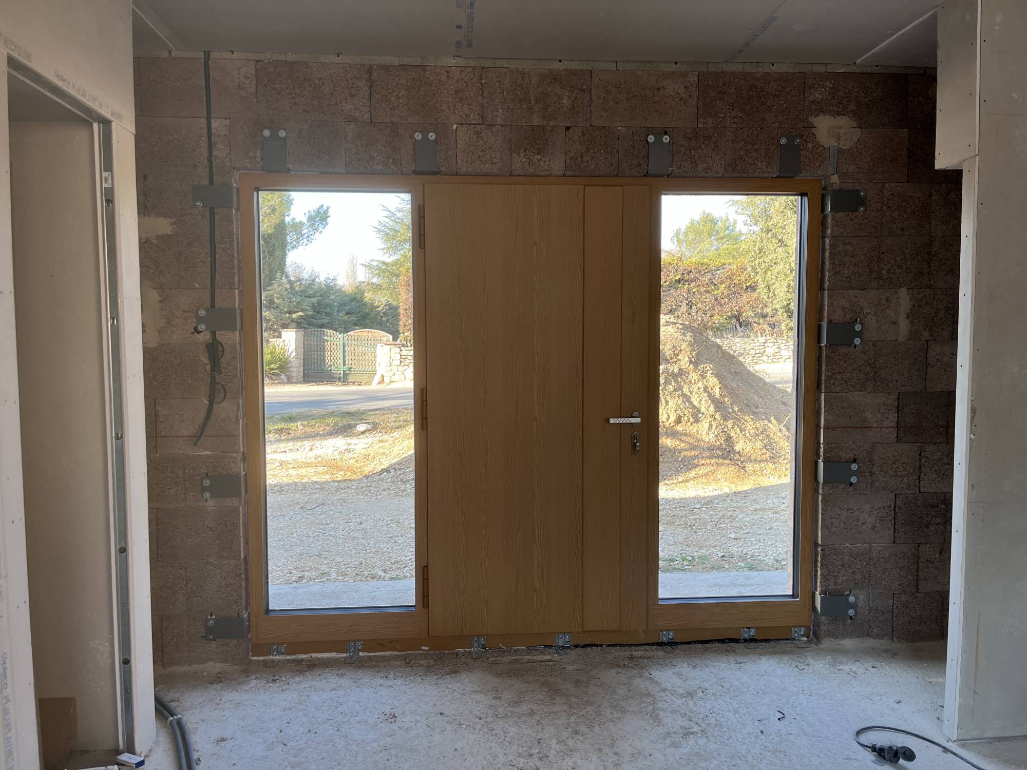 Nos poseurs salariés de GDM ont réalisé la pose en tunnel d'une porte d'entrée en aluminium grande largeur haut de gamme avec châssis latéraux fixes vitrés à Gordes dans le Lubéron (84).
