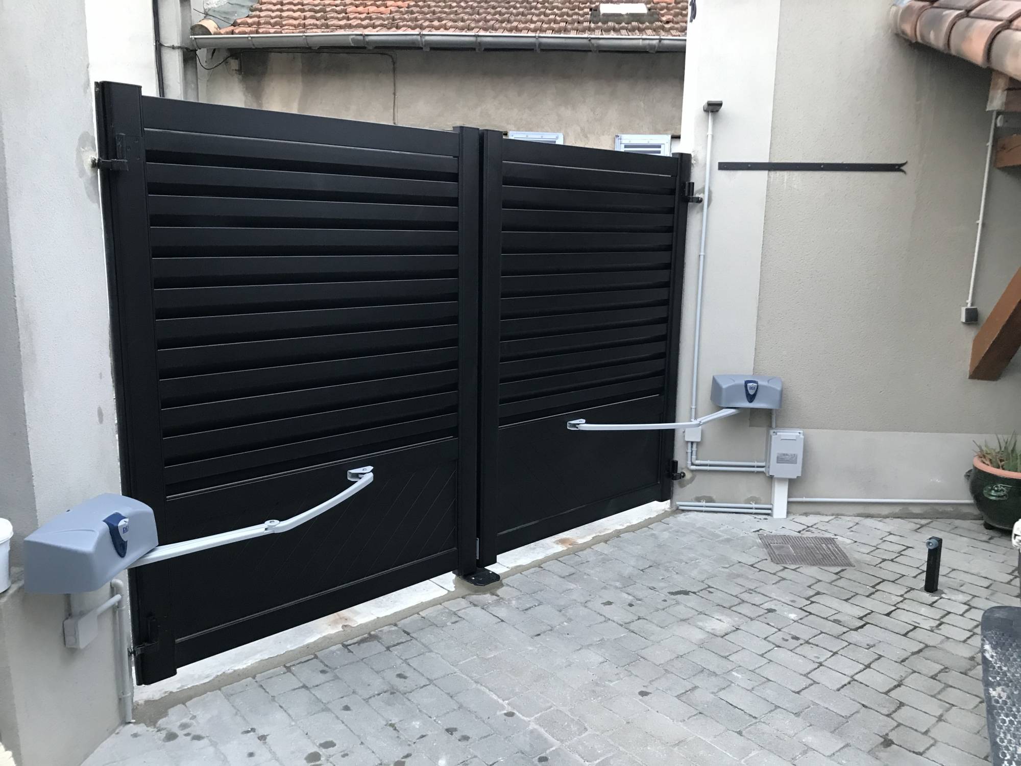 Les équipes de GDM ont mis en place le portail à double battants en aluminium à Avignon. Ils ont également posé la motorisation à bras DEA et procéder au raccordement électrique jusqu'au compteur.